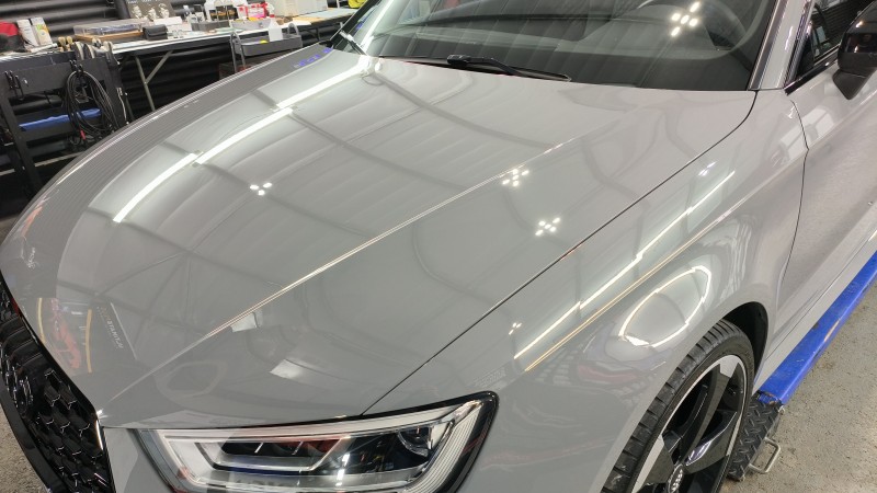 La céramique Gtechniq Crystal Sérum Ultra 10H, seule céramique certifiée ISO 15184 sur le marché, apportera à cette Audi RS3 une magnifique profondeur de couleur, un gloss et un effet miroir incroyable.