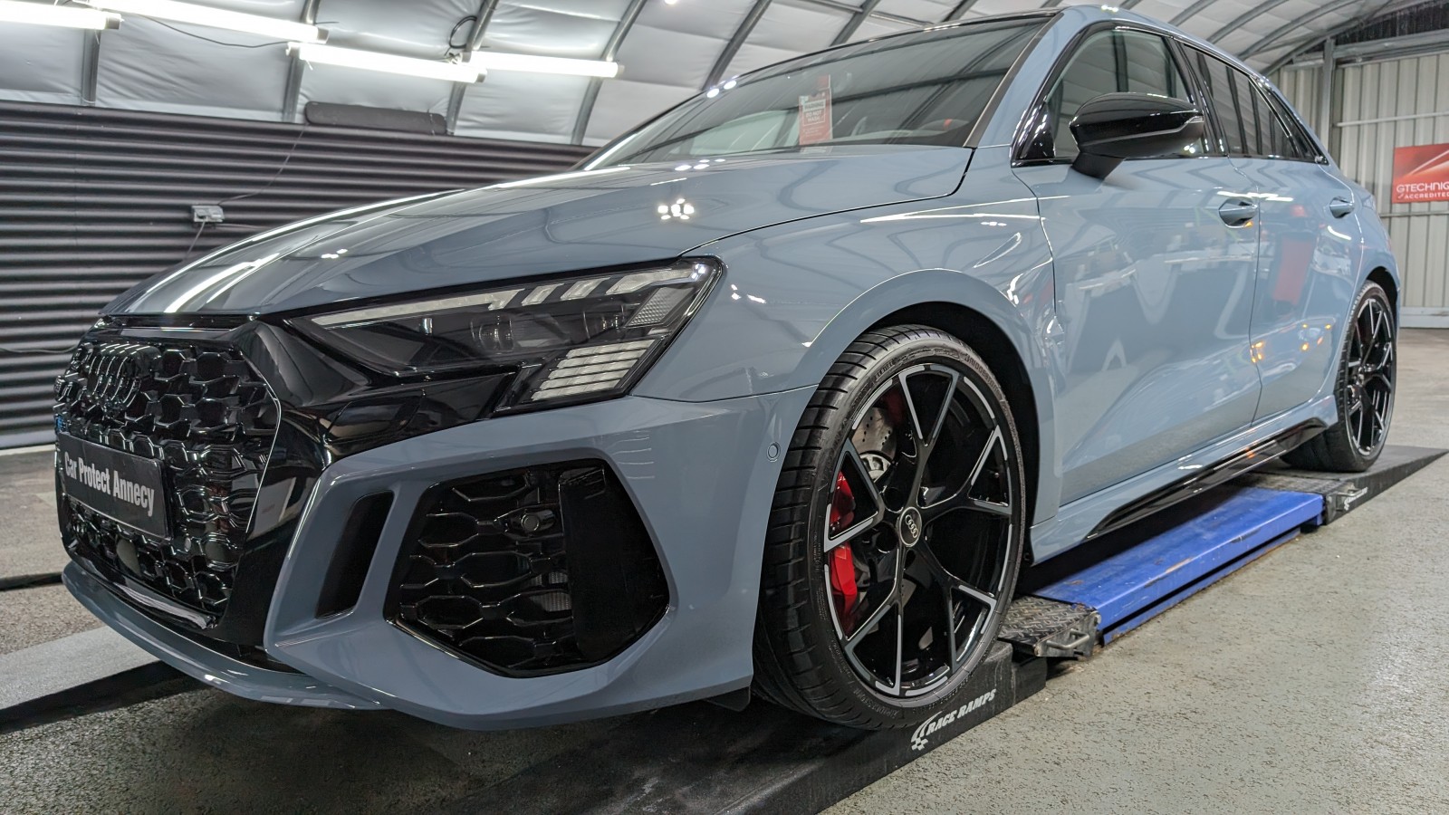 Audi RS3 gris Kemora neuve, toute récente acquisition de notre client qui habite en station.
